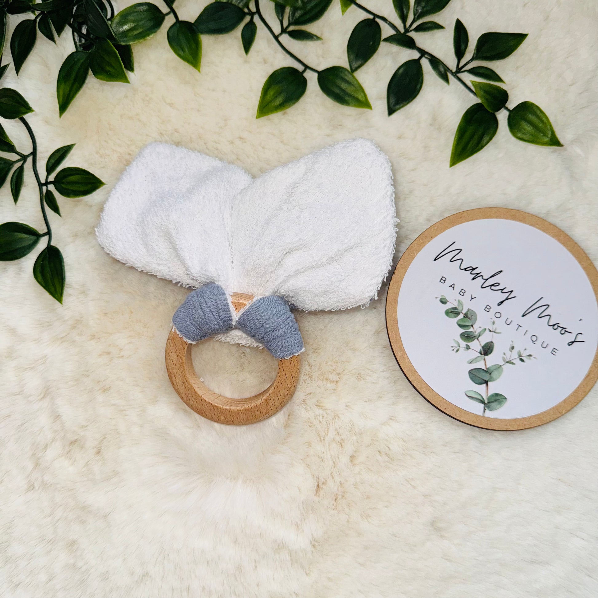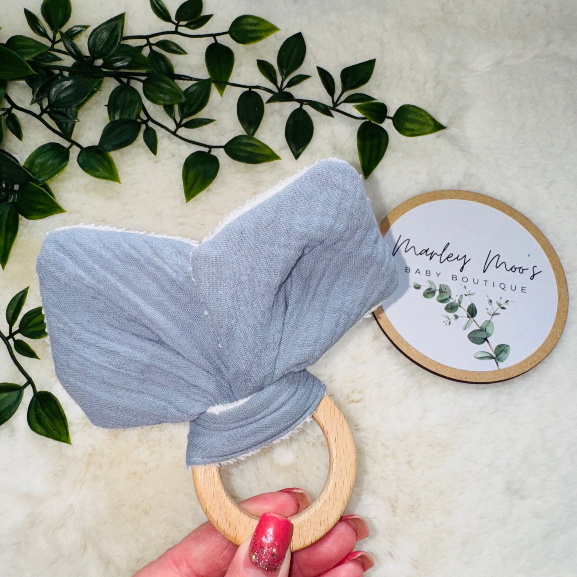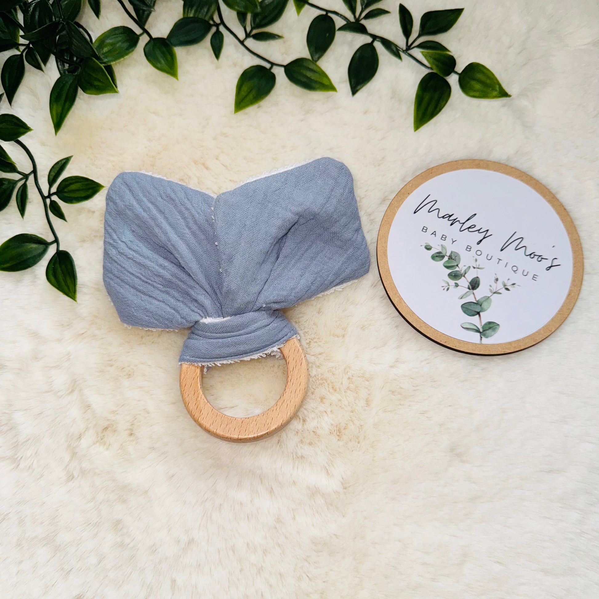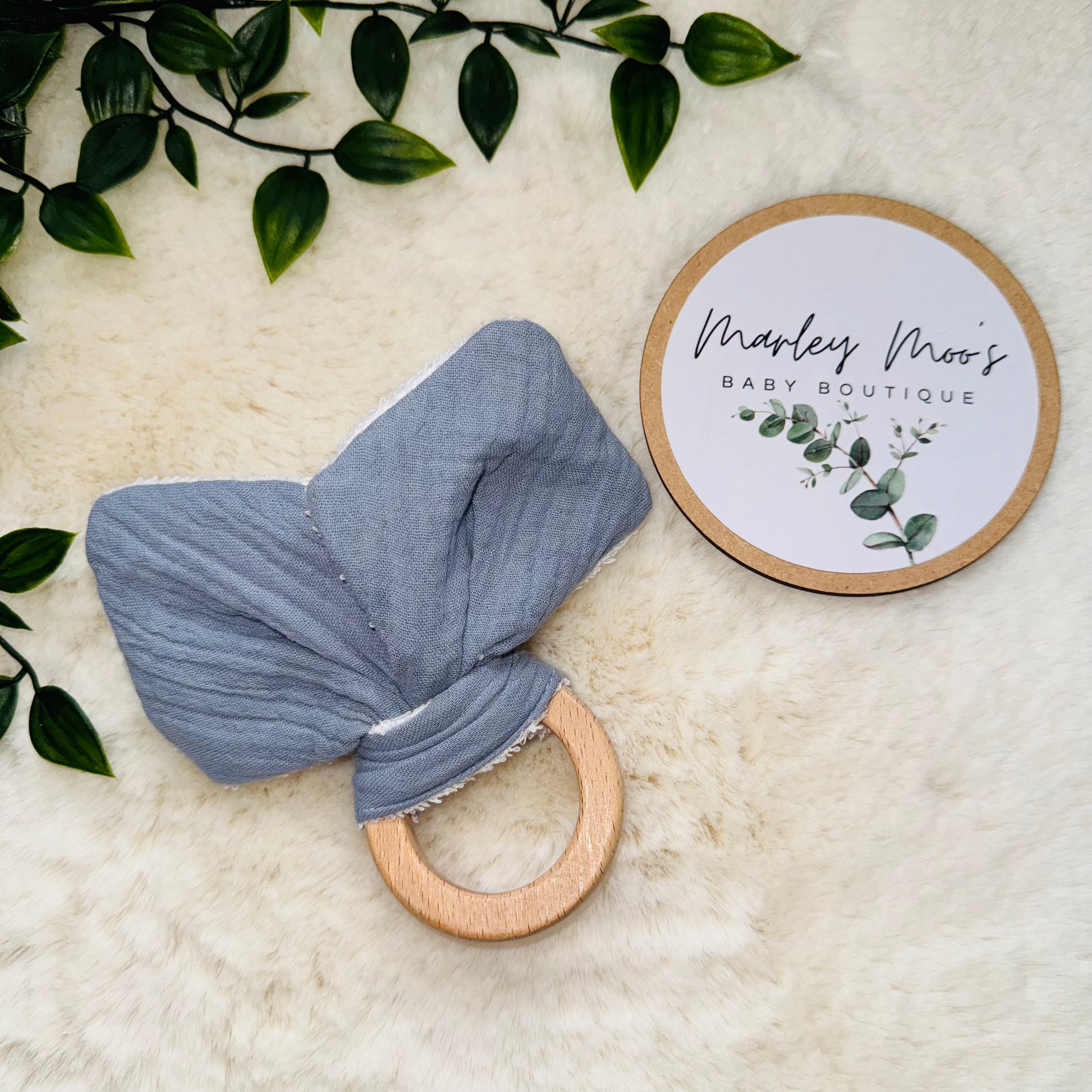 Marley Moo’s Wardrobe Bunny Ear Natural Wood Teether - Blue.