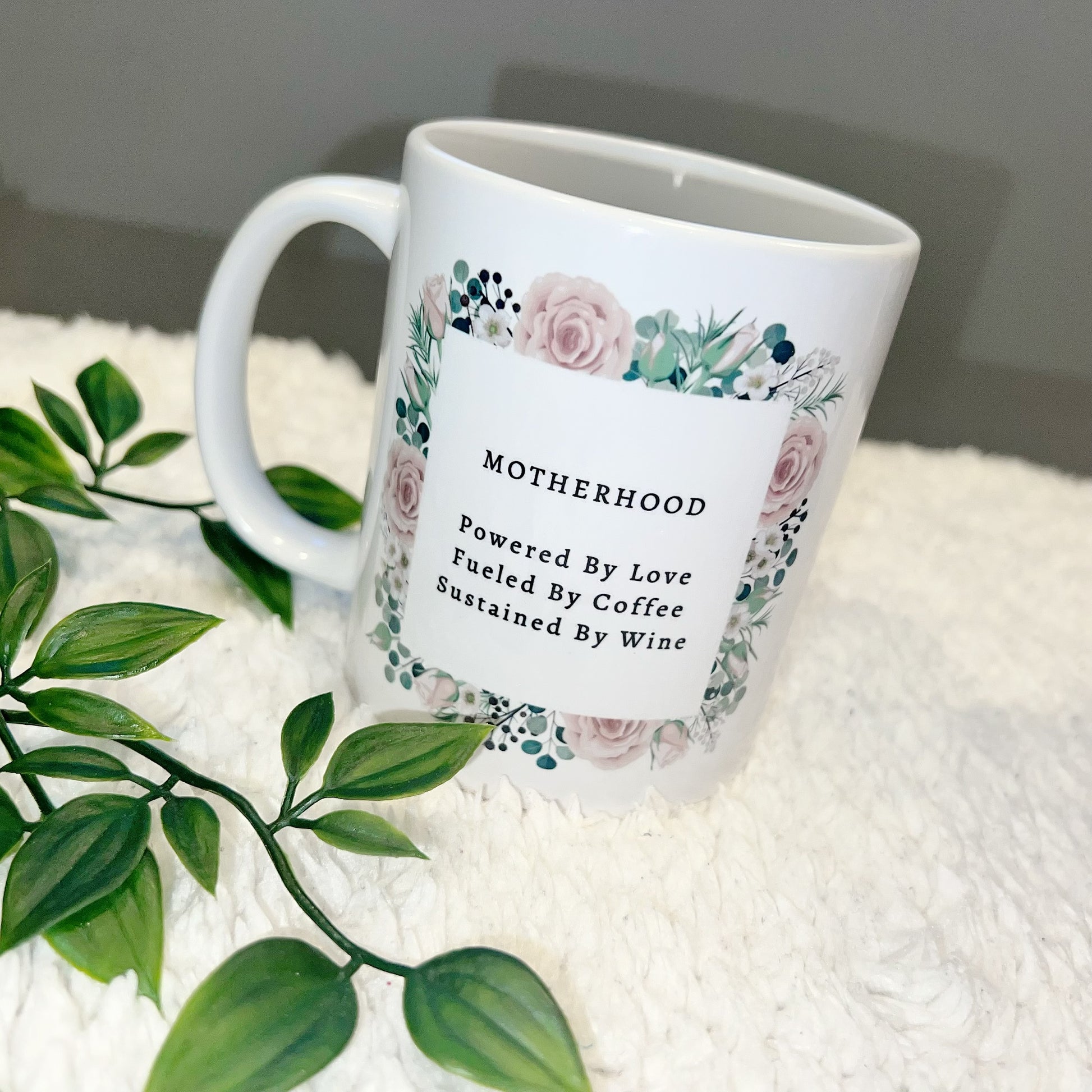 Powered By Love, Fueled By Coffee, Sustained By Wine’ professionally printed on it.