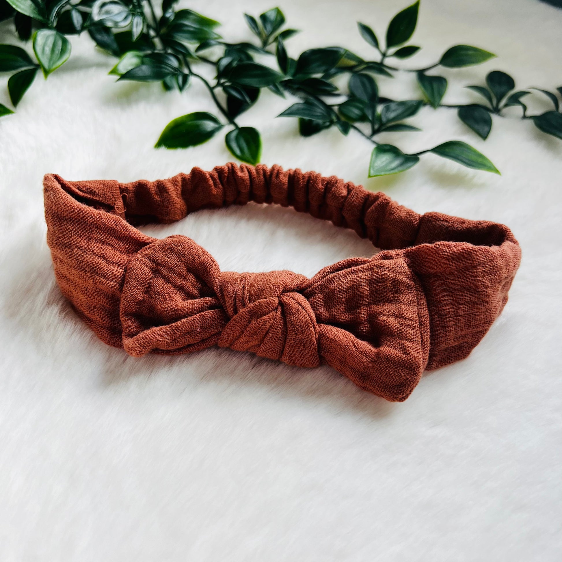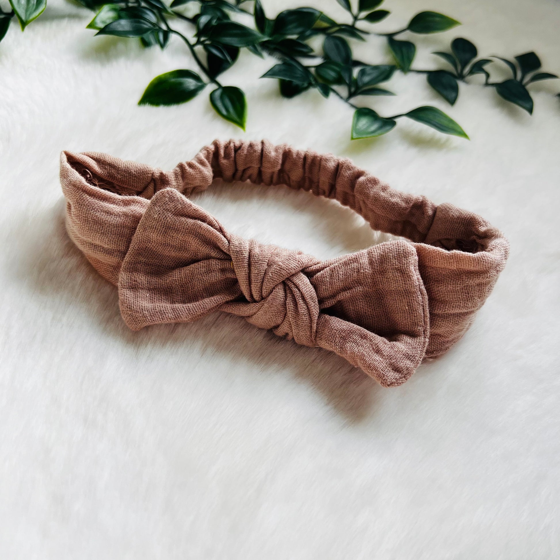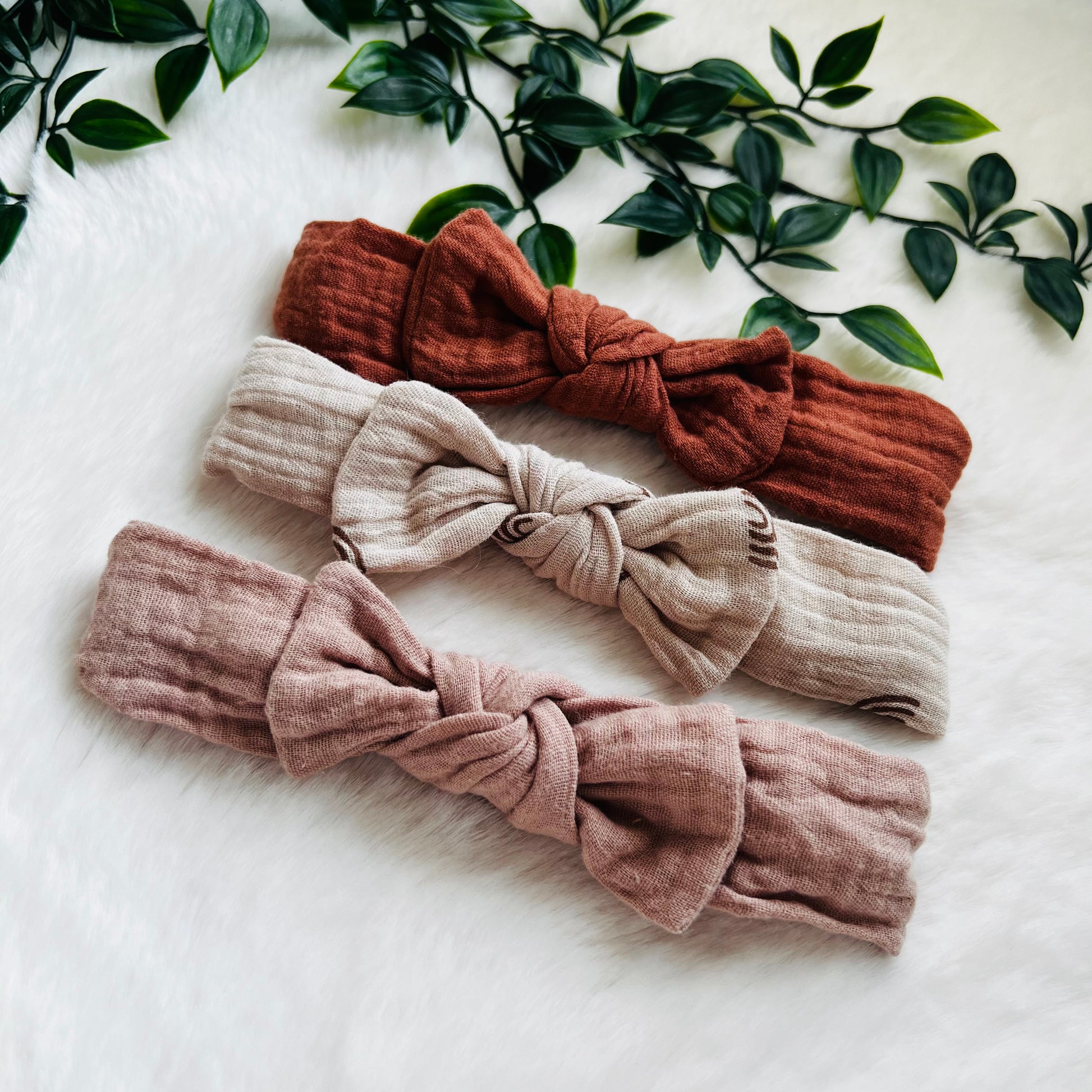 Three beautiful and stylish baby headbands with a pretty little bow and an elastic back. Made from 100% double gauze fabric. A perfect accessory for your little bundle of joy!