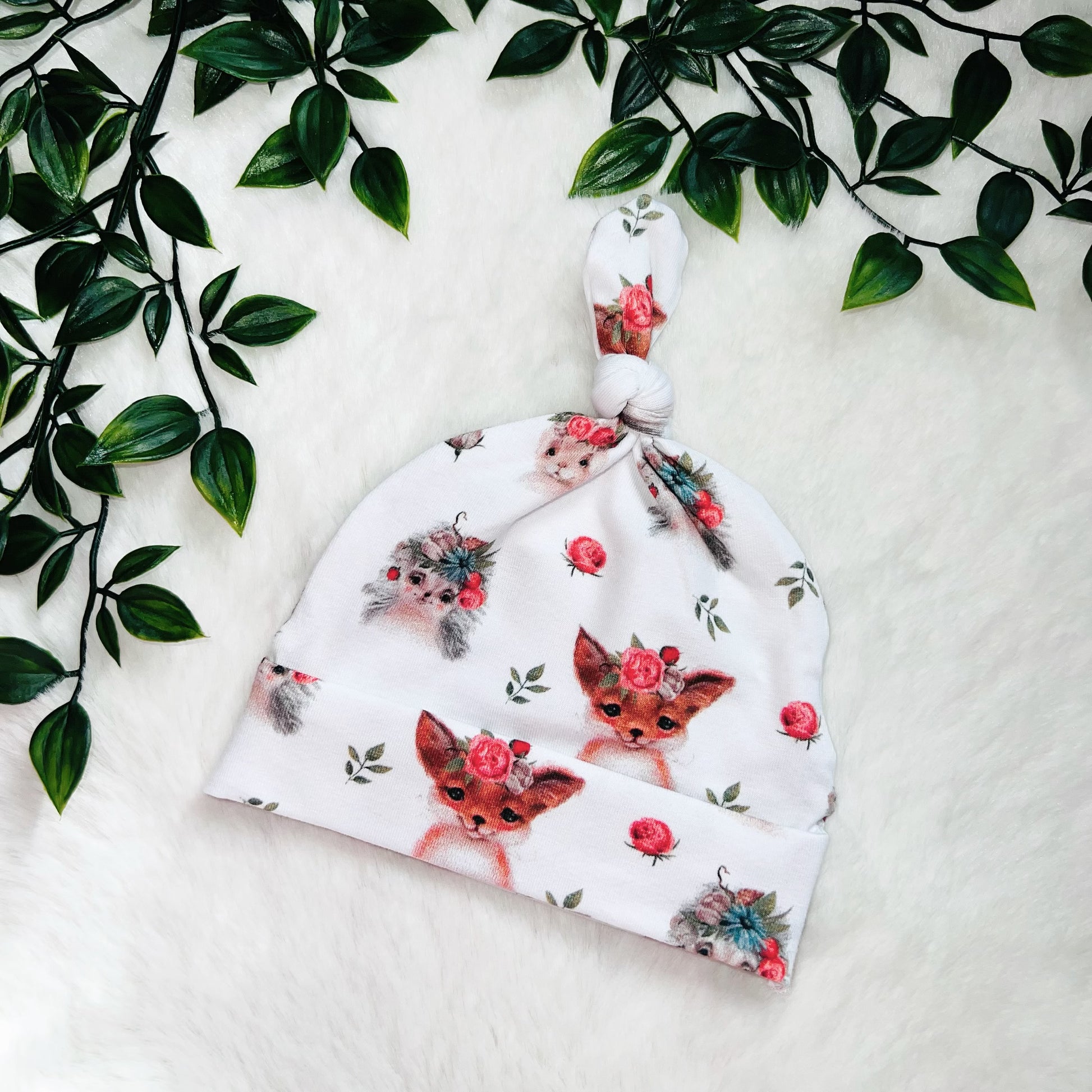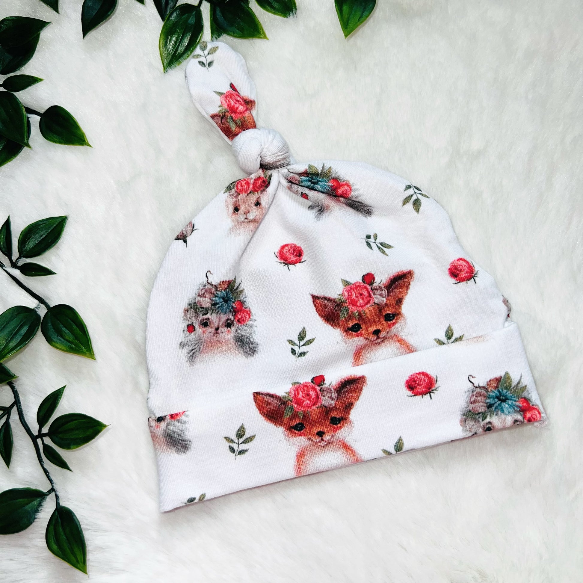 Marley Moo’s Wardrobe Baby Hat in a white woodland rose print.